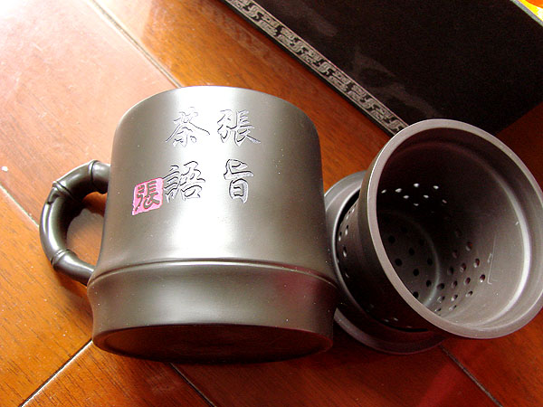 杯子烧有:张旨茶语。哈哈。杯子有漏的内胆可以过滤茶叶。