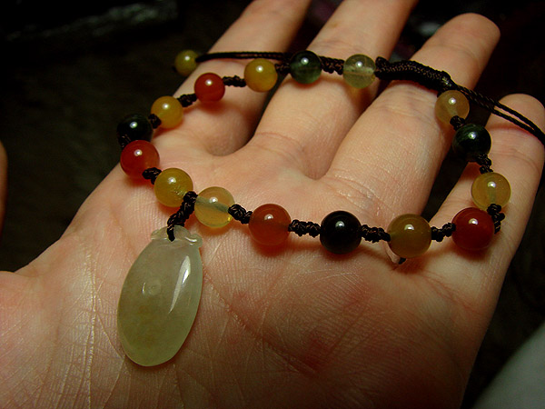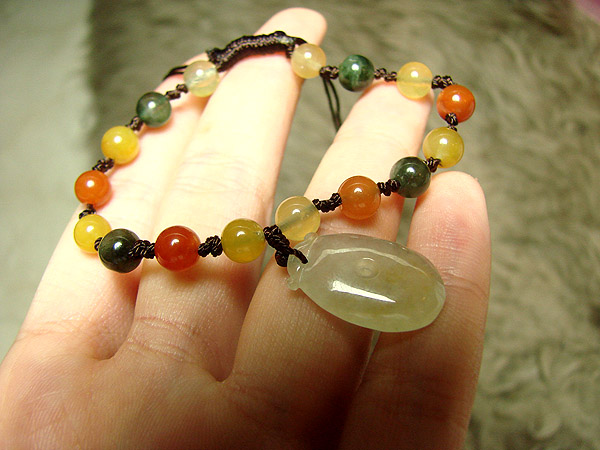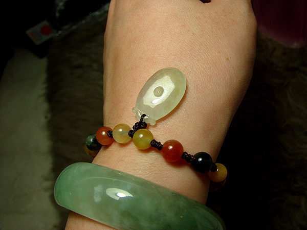 (除了主石是少见的冰种黄翡以外,配的小珠子。绿色的色很阳,紫色的很浓艳,而且是冰种的,非常罕见!搭配你手上万元以上的手镯一起来,一点都不逊色,而且相得益彰)