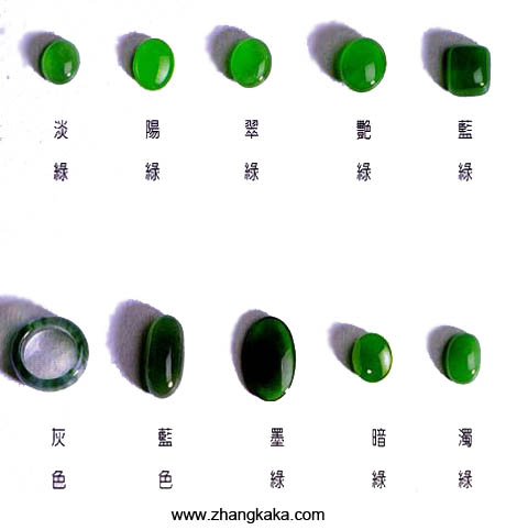 绿色品种的优劣顺序为绿色,微带灰的绿色,黄绿色,微带灰的绿色,灰绿色.