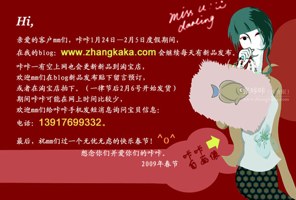 1月24日开始到2月3日的春节假日期间,咔咔要去外地旅行。这段时间内我会上网,会更新新品。可以接受预定,但是这段时间内无法发货。特此告知大家哦!