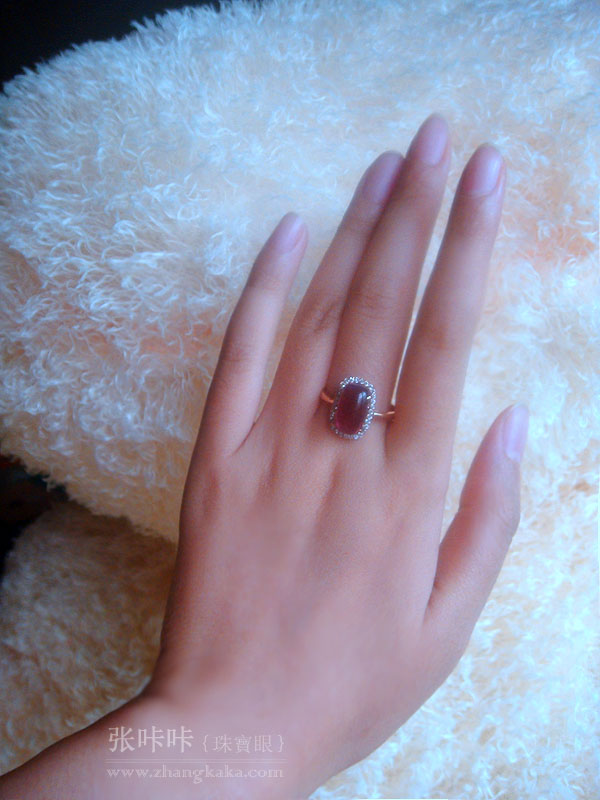 冰种红纹石镶嵌18k玫瑰金钻石童话枕头戒指: