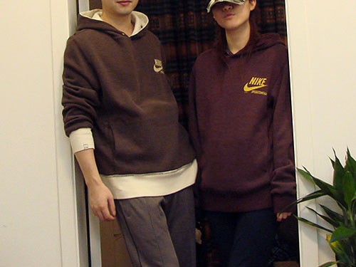 心情一好,消费欲望也来了,我们在游泳馆附近的运动品店买了整套的运动设备,当然,泳衣泳裤就不拍了,这两套Nike的运动服,运动裤,我就好喜欢,好像两只大灰熊。我的那件,本来就是男款的小号,可是我喜欢这种宽大的型。
