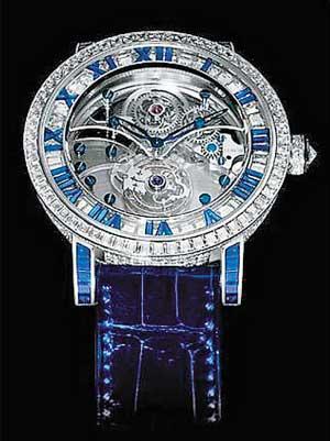 瑞士昆仑表给这款限量版手表取名叫“经典亿万陀飞轮”,850颗钻石覆盖着表壳、表耳、表把,44颗长方形蓝宝石让表圈灿烂夺目,罗马数字上显著的宝石,提升了分秒流逝的魅力。这款手表有各种不同配置版本,售价从32.5万美万(约合人民币244万元)~99.8万美元(约合人民币749万元)不等。如果要下手那可得动作快,因为全球一共只有10块陀飞轮。