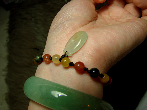 (除了主石是少见的冰种黄翡以外,配的小珠子。绿色的色很阳,紫色的很浓艳,而且是冰种的,非常罕见!搭配你手上万元以上的手镯一起来,一点都不逊色,而且相得益彰)