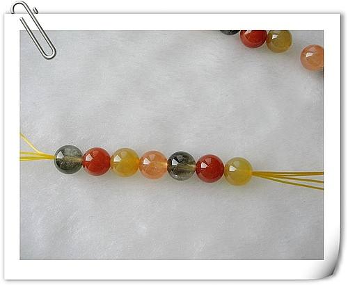 ⑧将线头拉入您串的第一颗珠子的孔内,整理珠子之间的距离使之均匀美观。