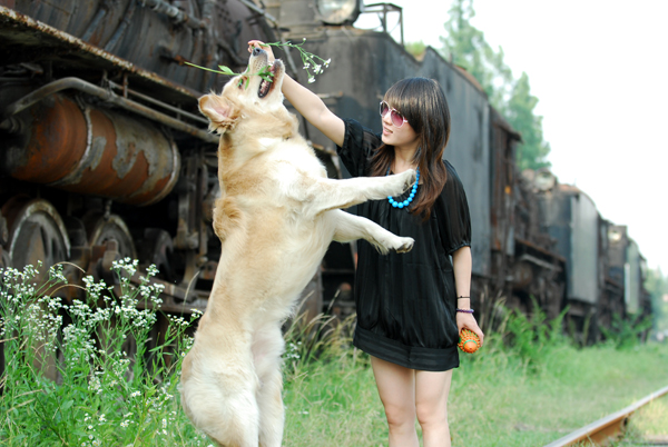 我又翻到她近期和她最宝贝的狗儿子,最最帅气可爱的金刚宝宝的合影!帅吧~~美女帅狗~~~
