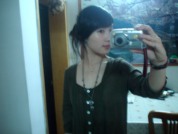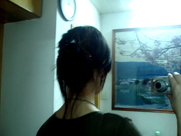 她昨天看了我的韩国头,也去盘了一个,其实她之前盘法就学的比我早的,但是这次她是直发,所以碎法比较多,容易掉下来~~她传了几个照片给我看~~