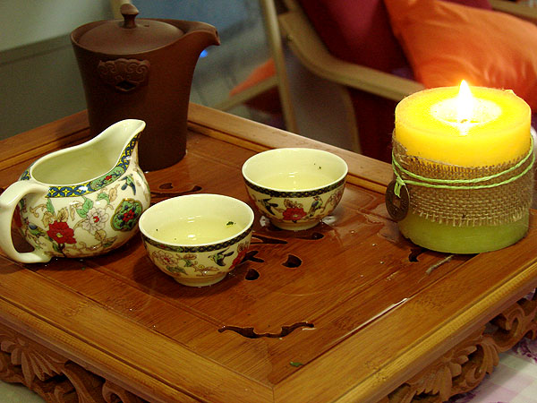 下午两个女人开始喝茶~~话说龙哥从福建带来的给我的礼物特级福建安溪铁观音,cici很有拥有的欲望,我就满足了她——泡给她喝!用了龙哥送的紫砂壶,和我自己原来的那套瓷茶杯~~~看起来还挺像那么一回事!因为是真空压缩包,所以没有经过洗茶叶的第一泡~第一泡时间在60秒左右,后续每泡累加10秒,我们的第一泡就很失败,没有时间概念,苦死。而那个小壶的作用就是在到了时间后,把装满茶叶的茶壶里的茶倒入此壶,然后用此壶倒入小杯,这样就很利于控制泡茶的时间。
