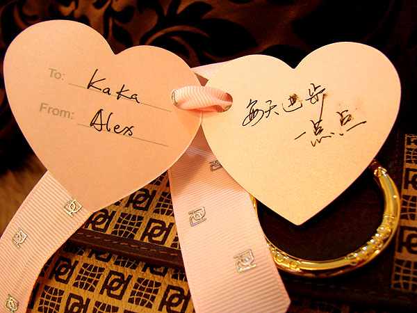 今天打开车门,副驾驶位置上赫然一个可爱的ports袋子,扎着粉色的心形卡片。你温暖地微笑看我。我知道你会给我一个心动的礼物,每一个节日,你也从来不让我空等。