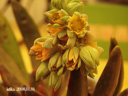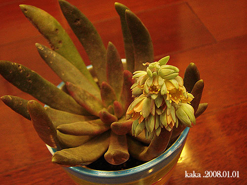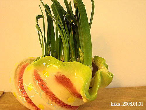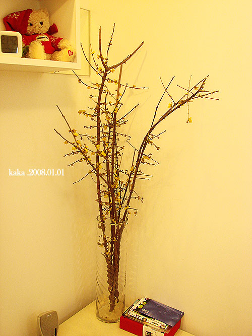 腊梅香气袭人,要比佳丽的清新剂化工香味美妙得多,富贵竹树枝没有根都可以活很久,还有一小盆宝石花,我曾经小时候养宝石花养到被太阳晒焦,这次千万不要,就在屋里好好藏着,而且,竟然是少见的开花了呢。还有水仙,买这一支的原因是它的海螺形壳子,不仅可爱,而且螺形从风水上说是敛财的,08好兆头,还有我喜欢的藤蔓植物,配了一个扁鱼形玻璃缸.突然更加曼妙了起来。